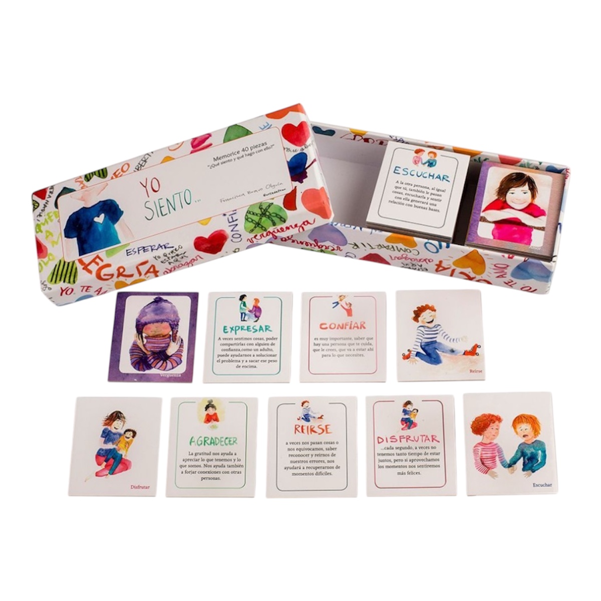 Contenido: Muestra 20 emociones distintas y 10 formas de gestionarlas, o cartas con preguntas sobre sentimientos.