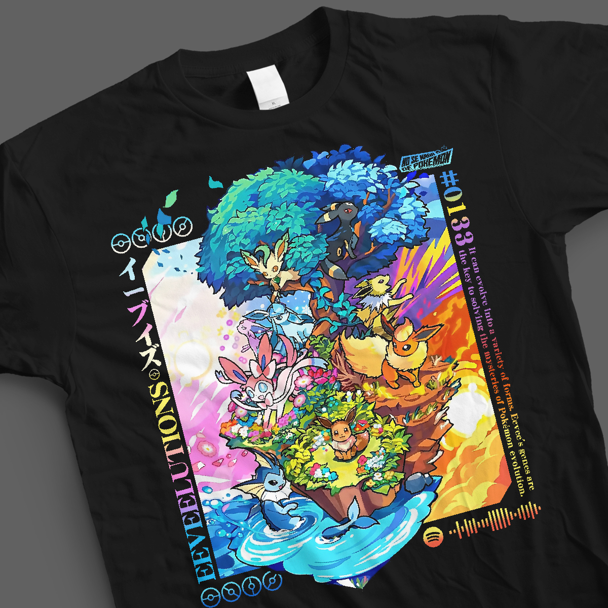 Eevee, Jolteon, Vaporeon, Flareon, Espeon, Umbreon, Glaceon, Leafeon o Sylveon. No nos pudimos decidir por cual de todas las evoluciones de Eevee destacar en éste diseño adaptado de la carta inmersiva de la edición «Eevee Grove» del TCG Pocket del Pokémon tipo Normal de Kanto, así que nos quedamos con todos al mismo tiempo!